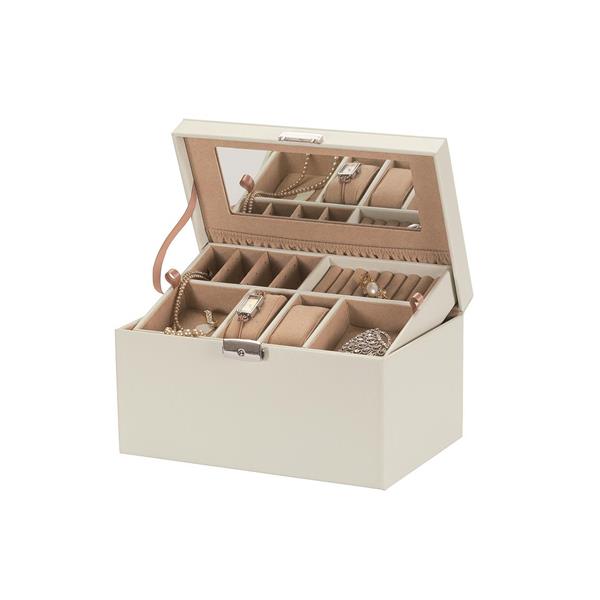 Ivory bonded leather jewellery case with tan interior and lift out tray.