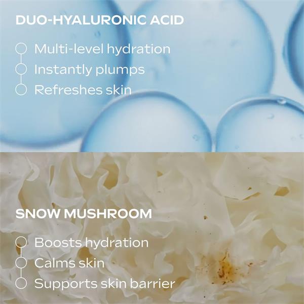 Quench your skin with nature's deepest hydration. This lightweight, fast-absorbing serum delivers both immediate and long-lasting hydration, helping to plump the skin, smooth fine lines, and restore a fresh, dewy glow. Snow mushroom, celebrated for its ability to hold up to 500 times its weight in water, works in harmony with skin-identical hyaluronic acid to support the skin barrier and lock in moisture. Use daily on its own or mix with your moisturiser for skin that feels soft, supple, and radiant.